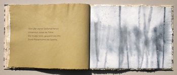 "Gewebe" Gedicht von Wolfgang Hilbig, 5 Zeichnungen, 3 Papierschnitte, Handschrift, Gewebeeinband, Japanische Bindung, Unikatauflage, 12 Exemplare, 2014 ca. 43 x 34 x 1 cm |